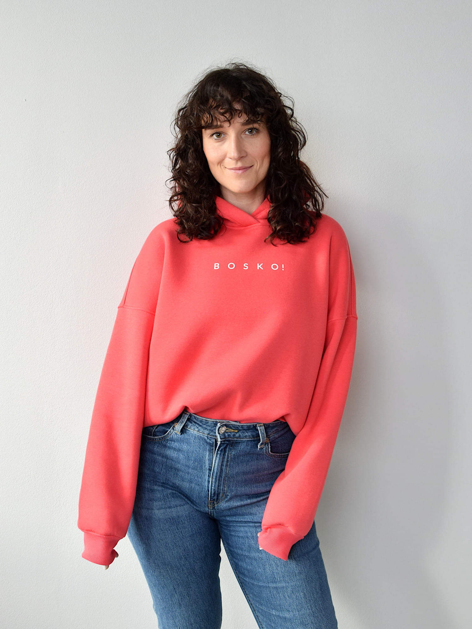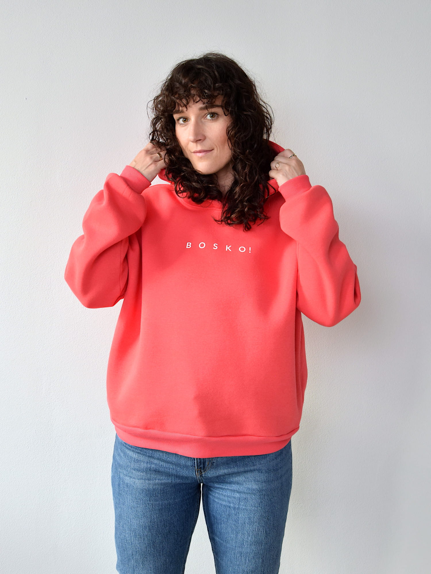 Słowo na bluzie jest wyrazem stanu, w jakim się znajduję, kiedy ją zakładam. Mięsista (określenie okropne, ale przyjemne w dotyku) i miękka, i doskonale skrojona. Po prostu BOSKO!, a do tego truskawkowo – na zimę, jak znalazł 🙂