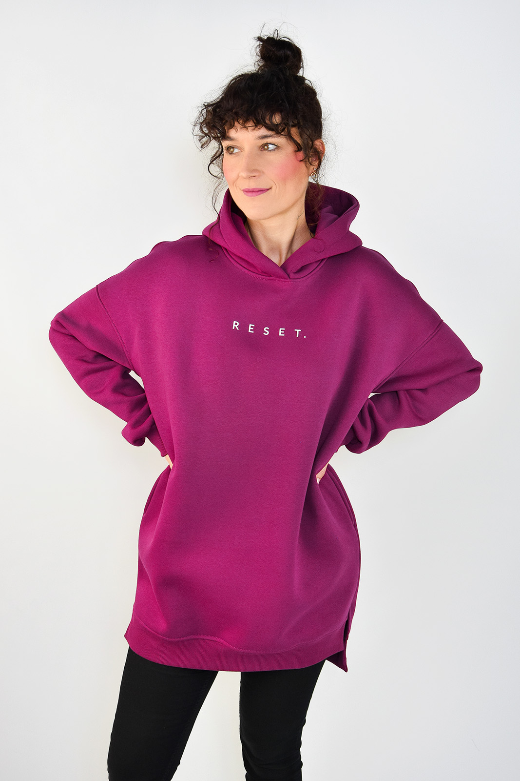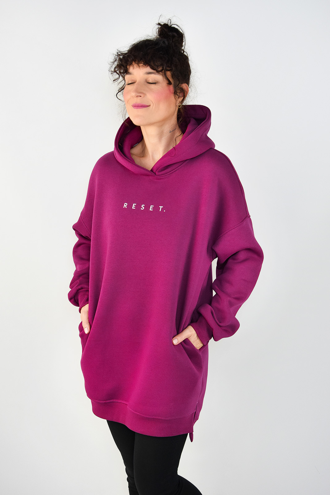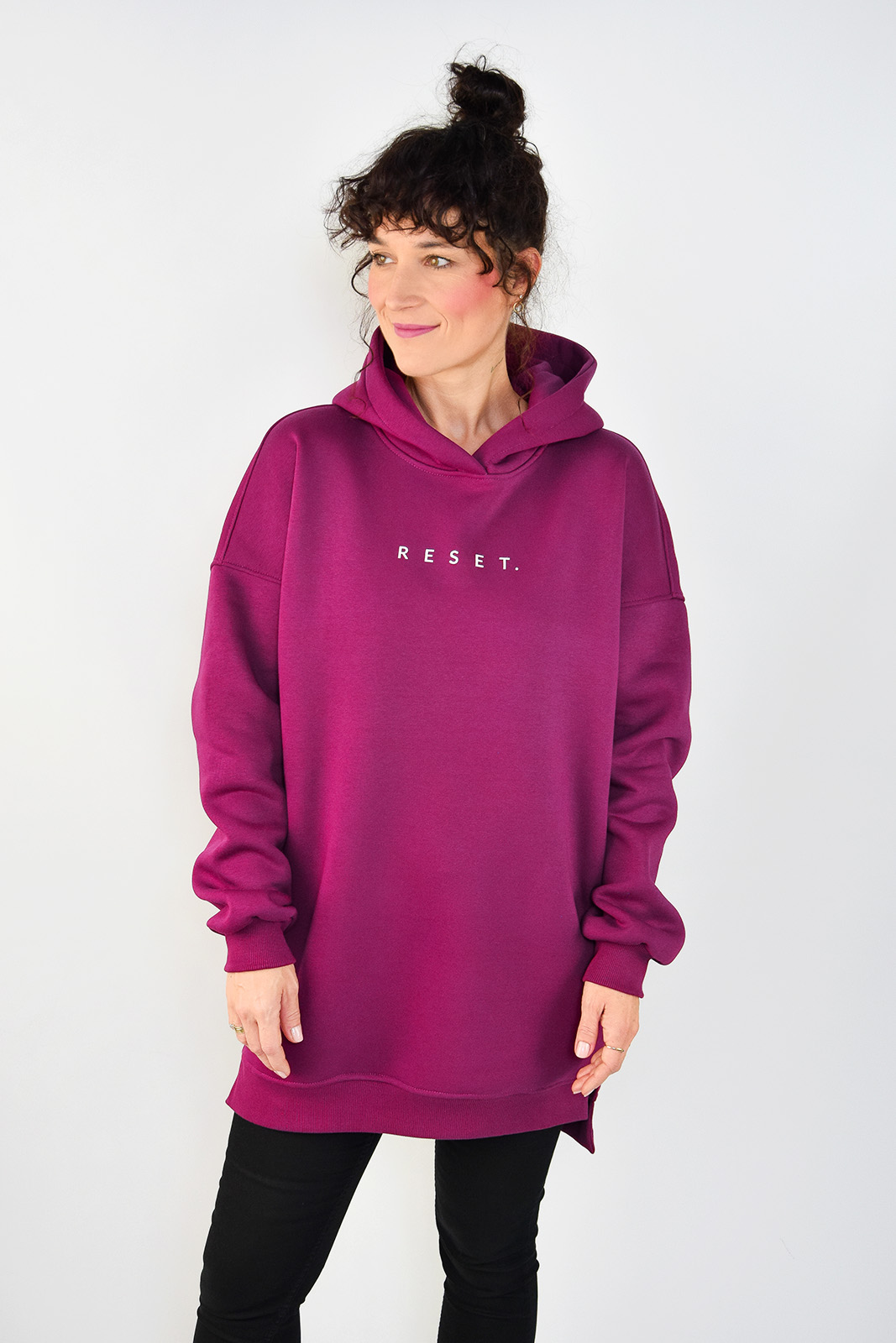 Długa, ciepła bluza long jagodowa RESET. o luźnym, oversize’owym kroju.