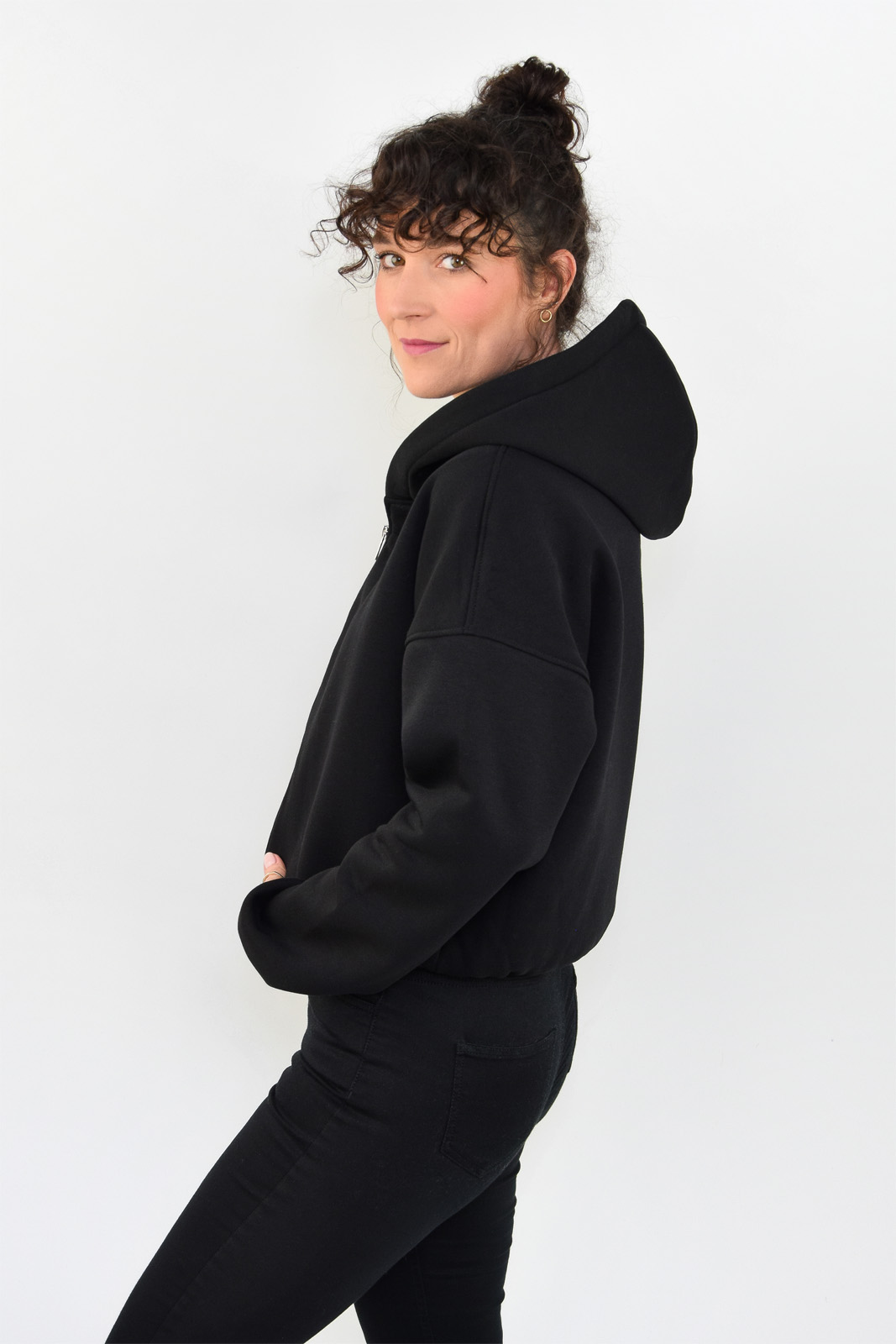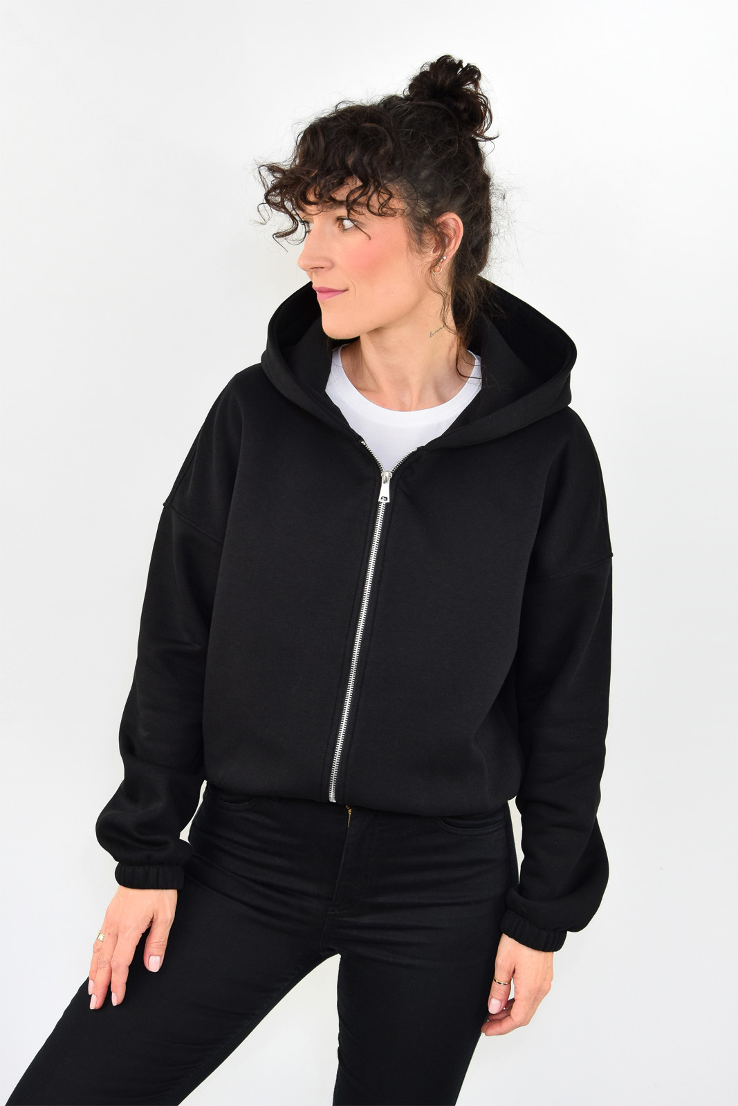 Z kapturem i z gumkami na rękawach, oraz na dole bluzy.