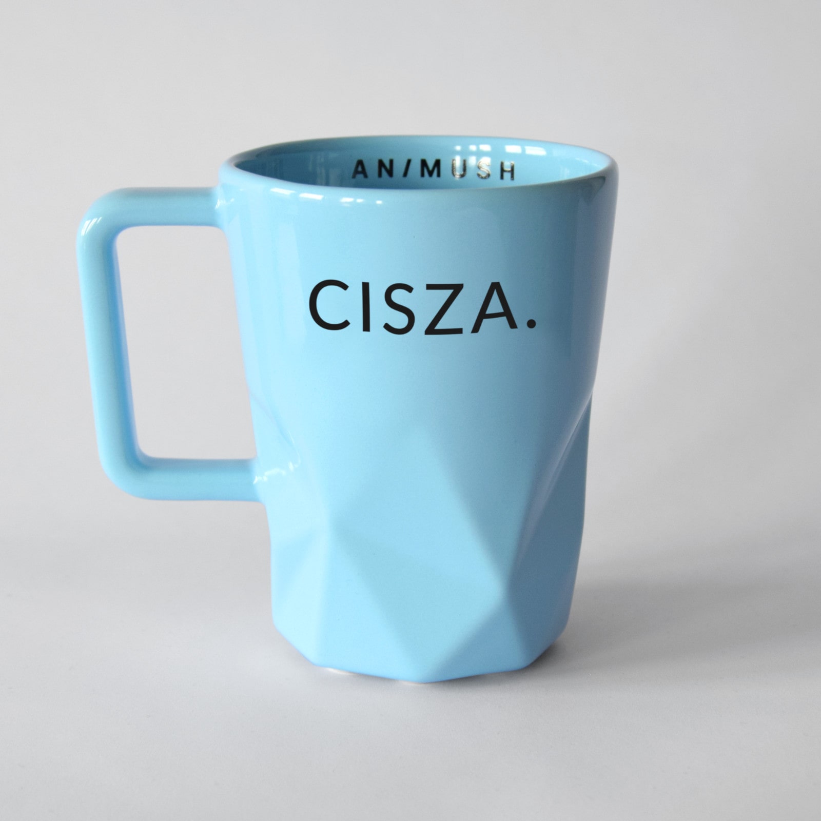 Kubek w kolorze błękitnym z trwałym nadrukiem CISZA. na zewnątrz, oraz logo ANIMUSH wewnątrz.