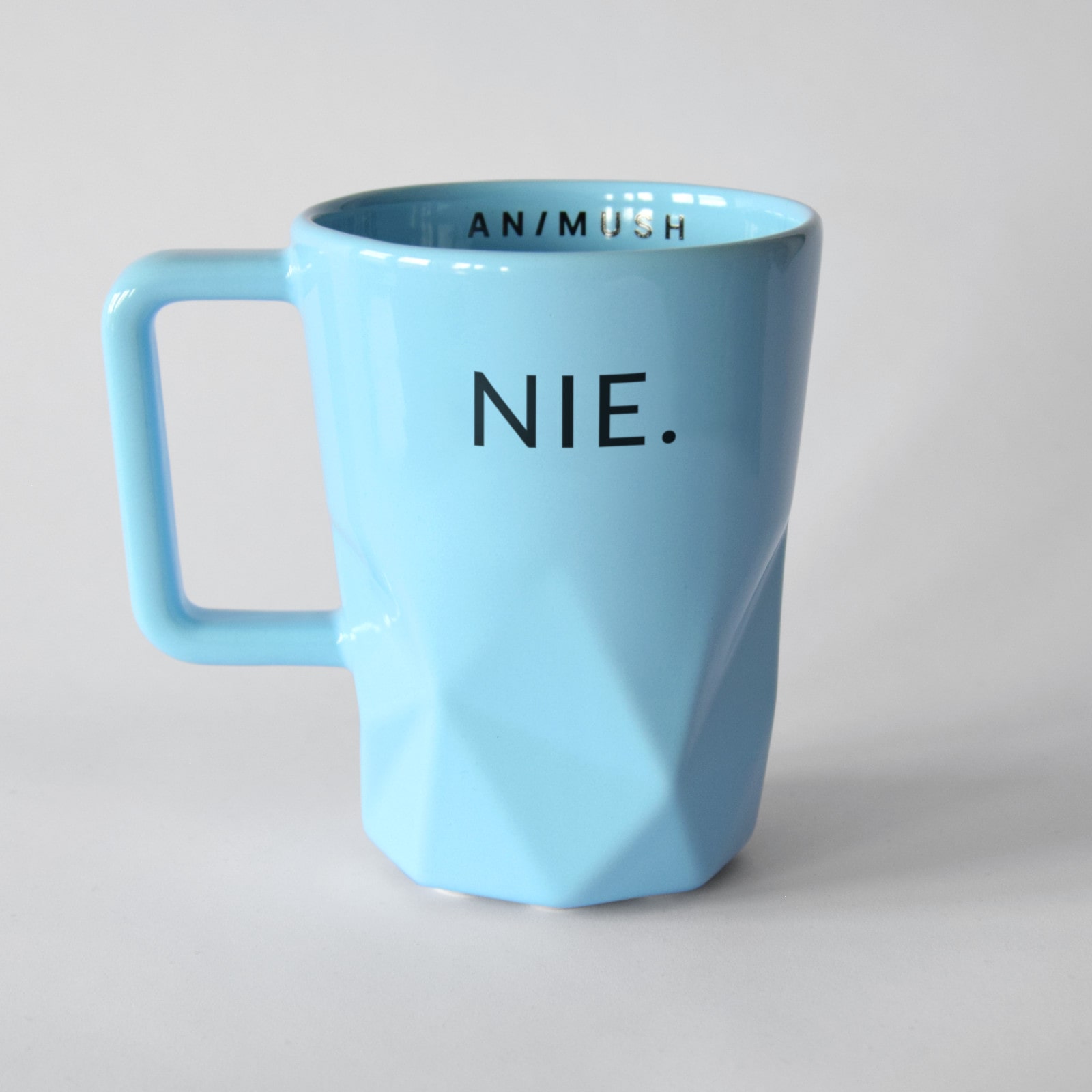 Kubek w kolorze błękitnym z trwałym nadrukiem NIE. na zewnątrz, oraz logo ANIMUSH wewnątrz.