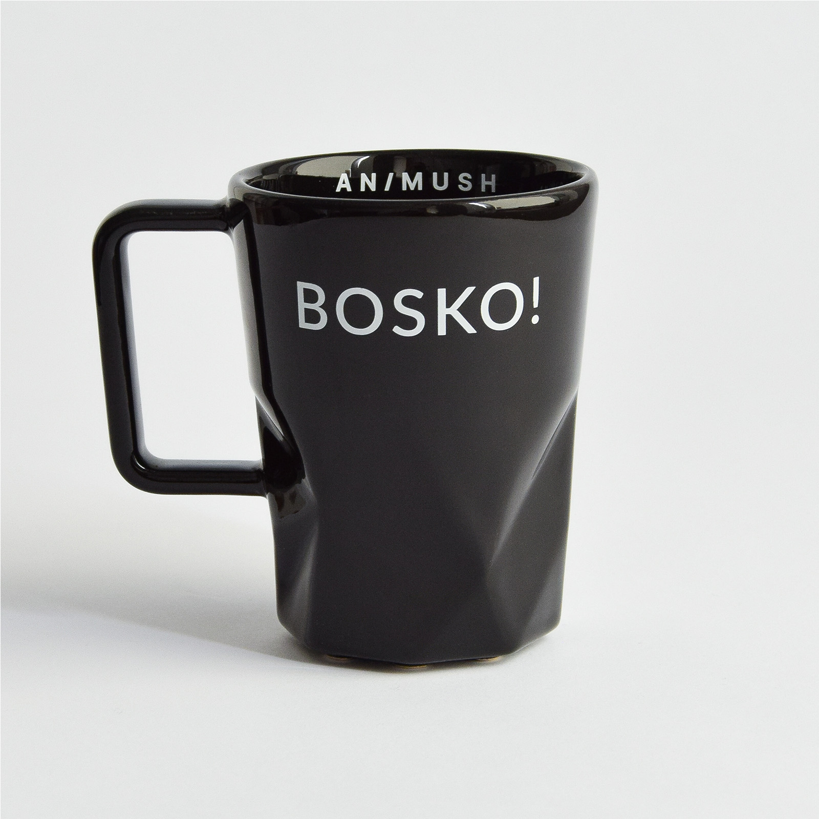 Kubek w kolorze czarnym z trwałym nadrukiem BOSKO! na zewnątrz, oraz logo ANIMUSH wewnątrz.