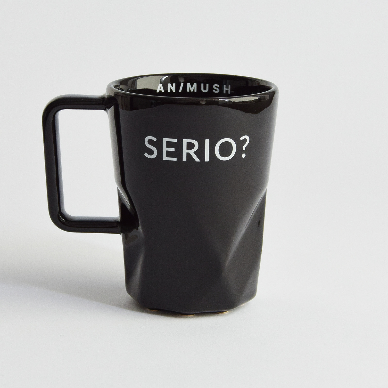 Kubek w kolorze czarnym z trwałym nadrukiem SERIO? na zewnątrz, oraz logo ANIMUSH wewnątrz.