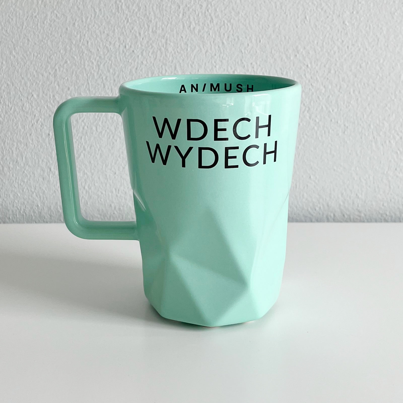 Kubek miętowy z trwałym nadrukiem WDECH WYDECH na zewnątrz oraz logo ANIMUSH wewnątrz.
