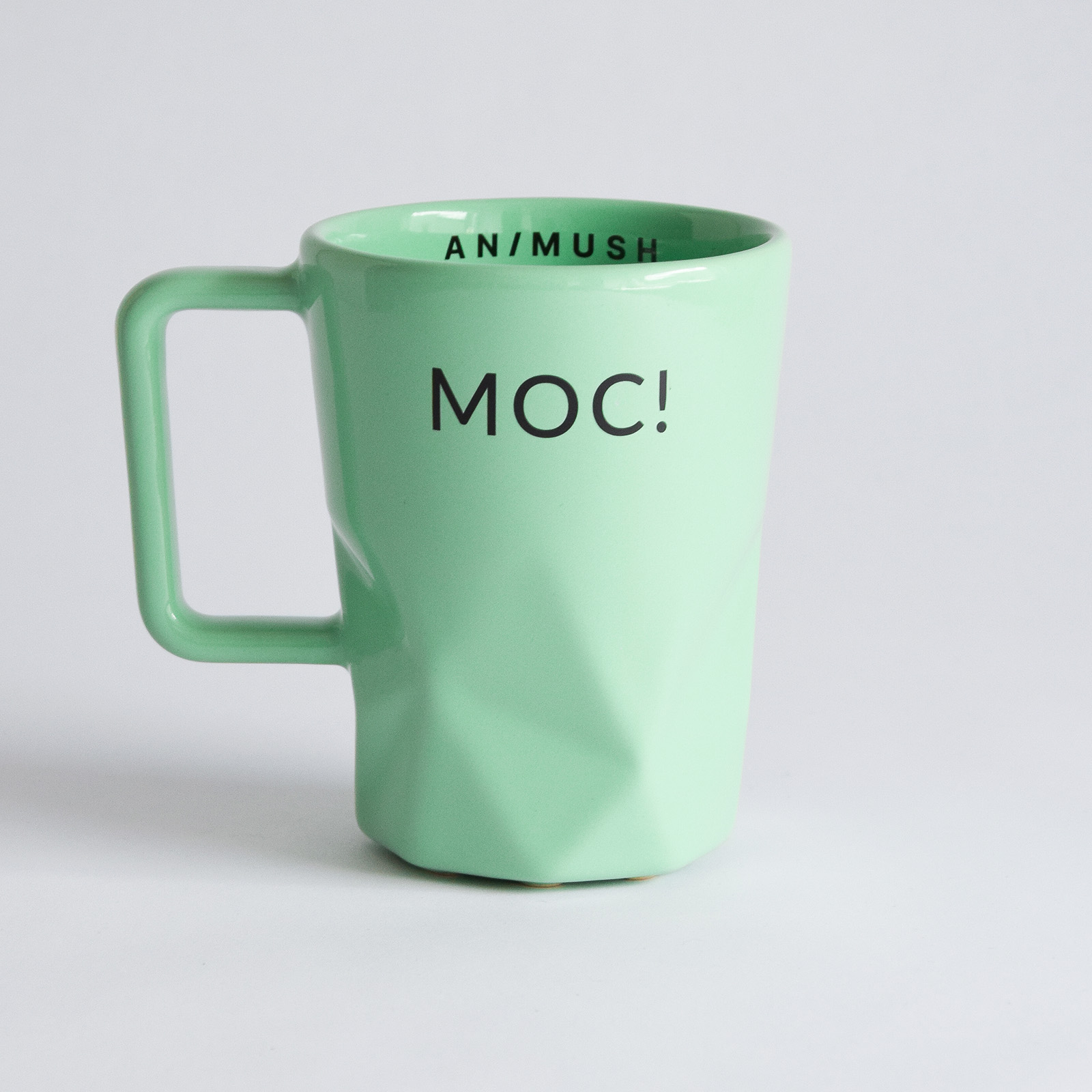 Kubek pistacjowy z trwałym nadrukiem MOC! na zewnątrz oraz logo ANIMUSH wewnątrz.