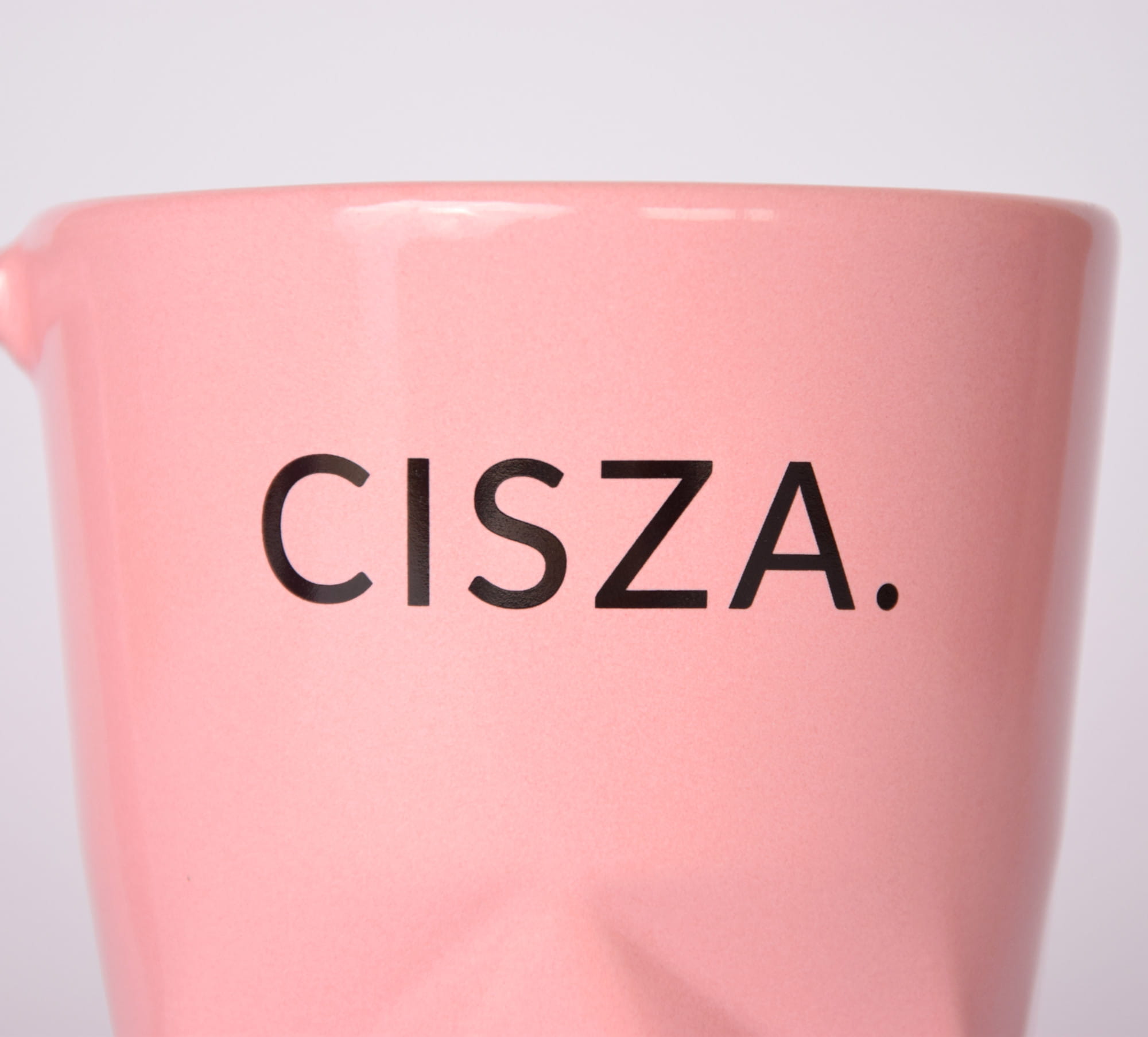 Kubek w kolorze różowym z trwałym nadrukiem CISZA. na zewnątrz oraz logo ANIMUSH wewnątrz.