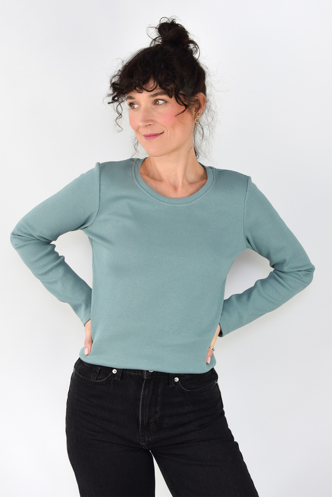 Bluzka z długim rękawem, uszyta z dzianiny o strukturze prążkowej.