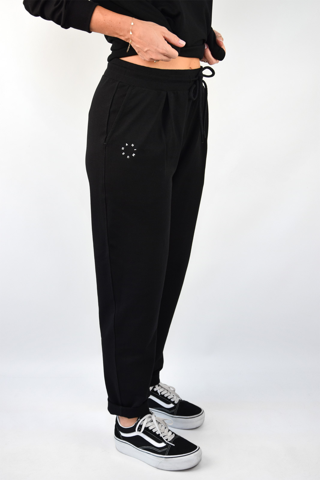 Spodnie dresowe czarne mają luźny krój.