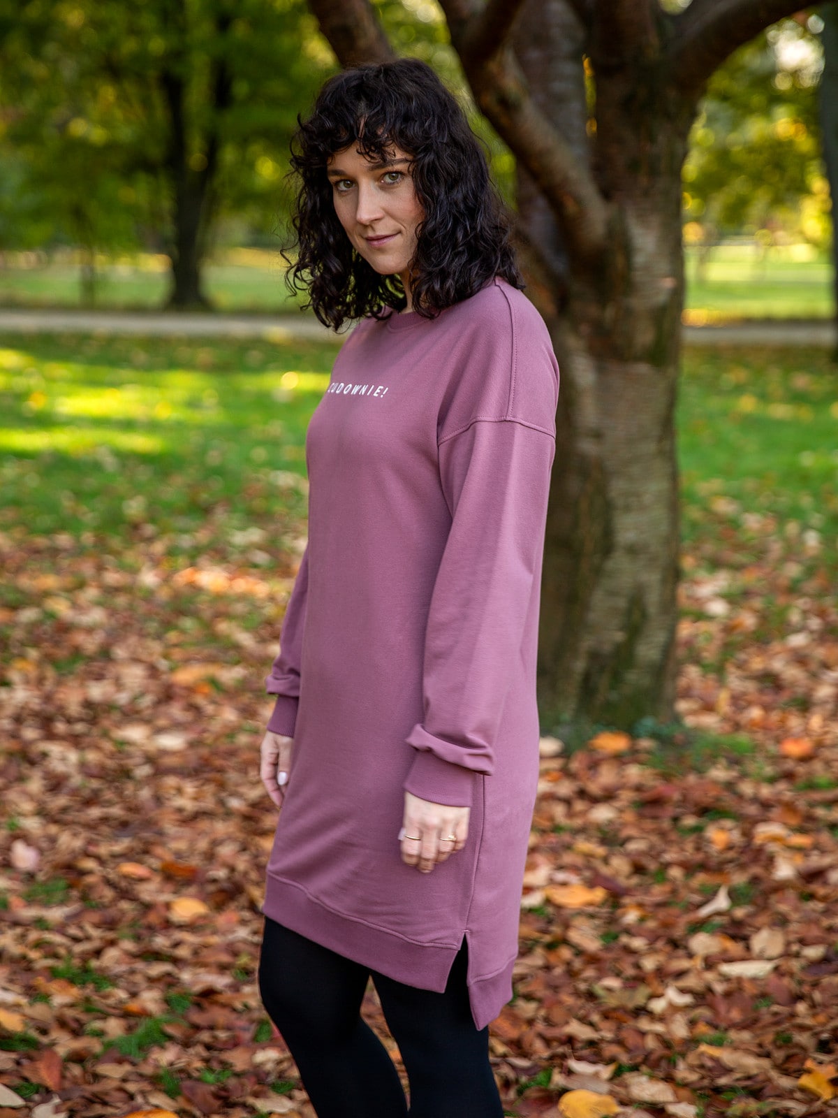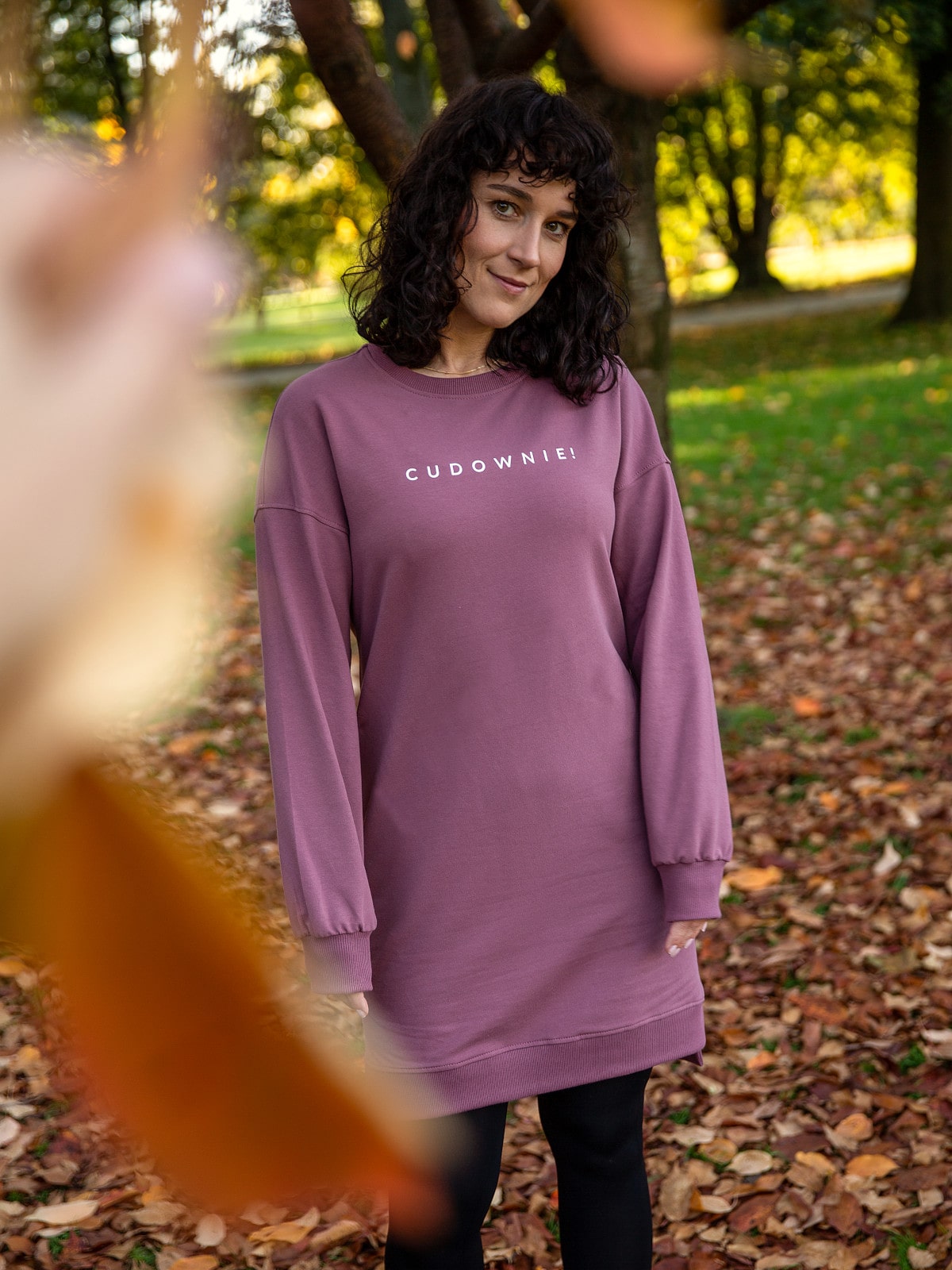 Bawełniana sukienka dresowa wrzosowa z napisem CUDOWNIE! o delikatnie luźnym kroju, z wcięciem w talii.