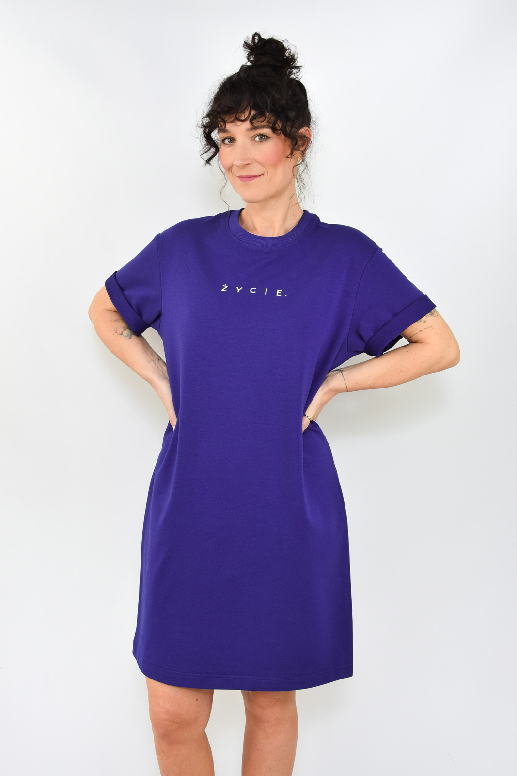 Bawełniana sukienka dresowa indygo z napisem ŻYCIE. o bardzo luźnym kroju.