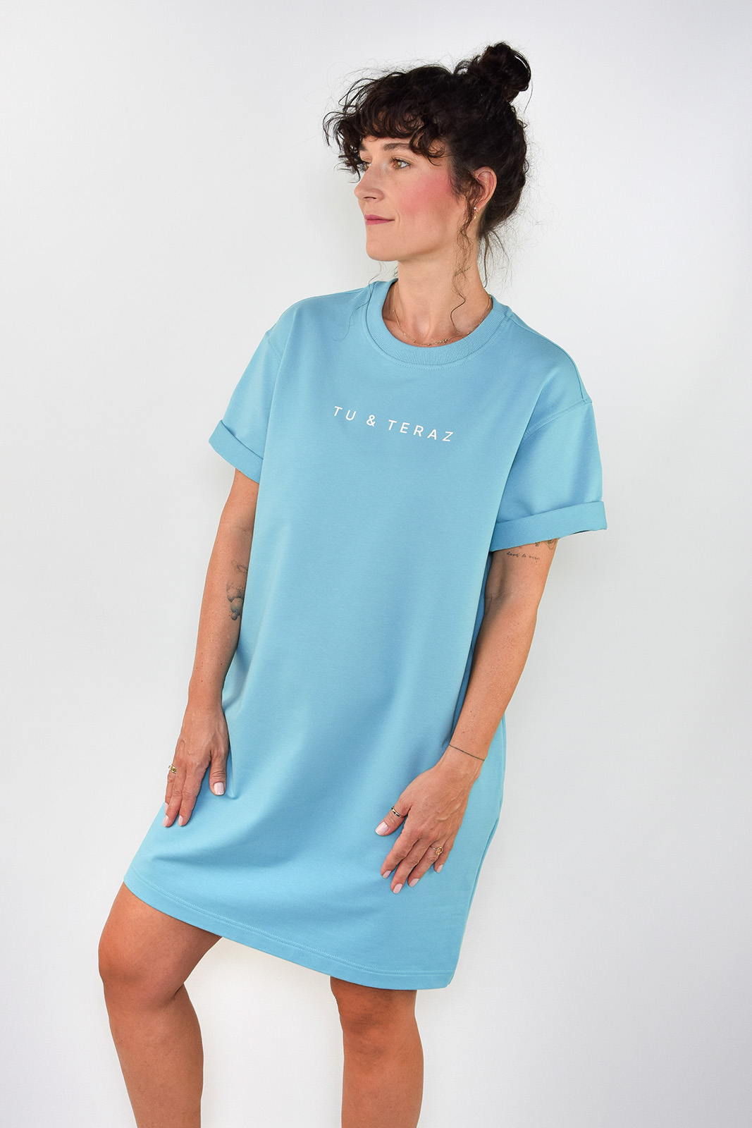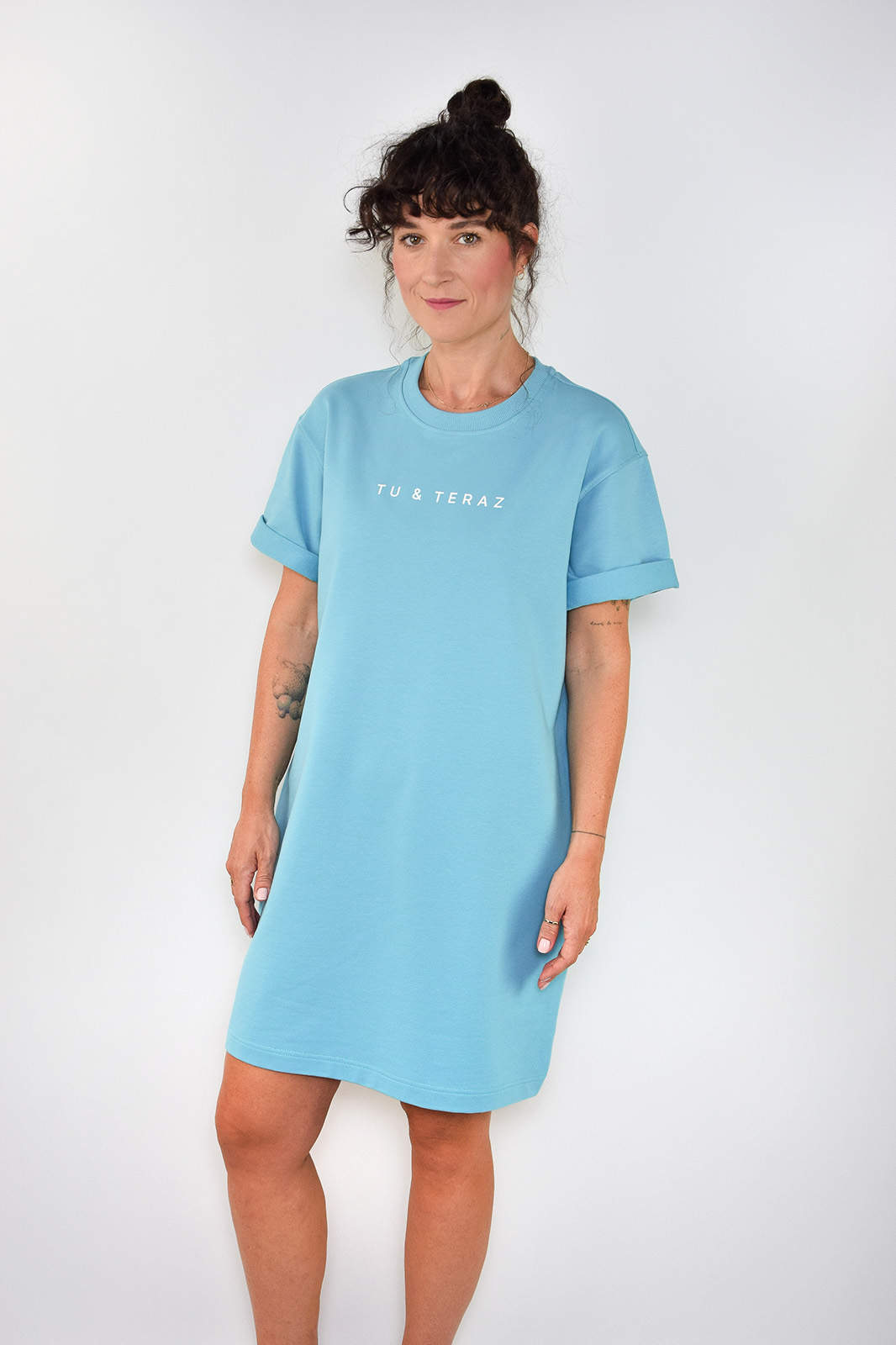 Bawełniana sukienka dresowa lazurowa z napisem TU&TERAZ o bardzo luźnym kroju.