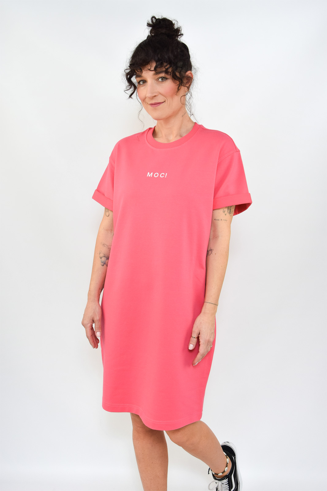 Bawełniana sukienka dresowa truskawkowa z napisem MOC! o bardzo luźnym kroju.
