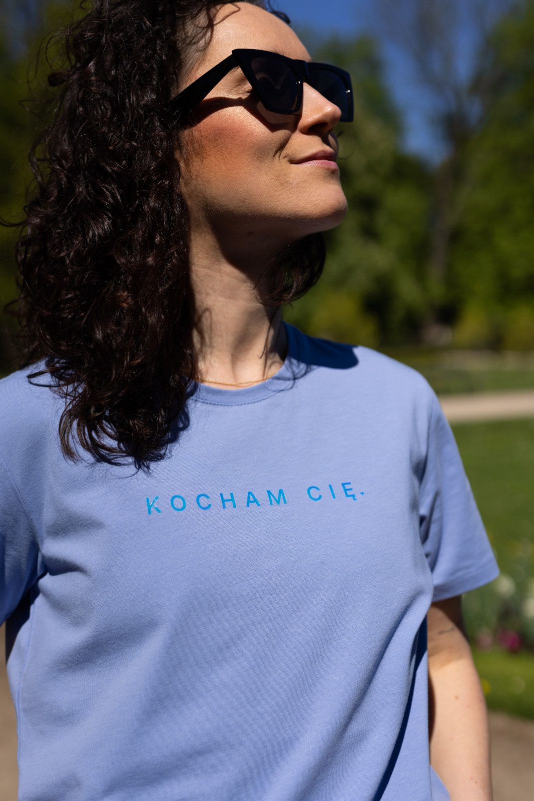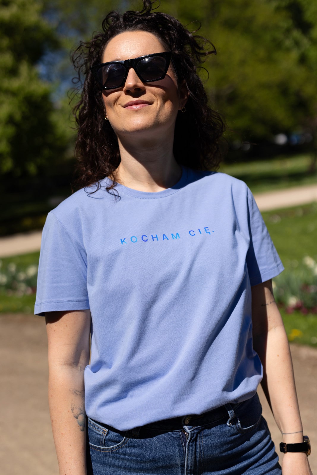 T-shirt oversize błękitny z tęczowym napisem KOCHAM CIĘ