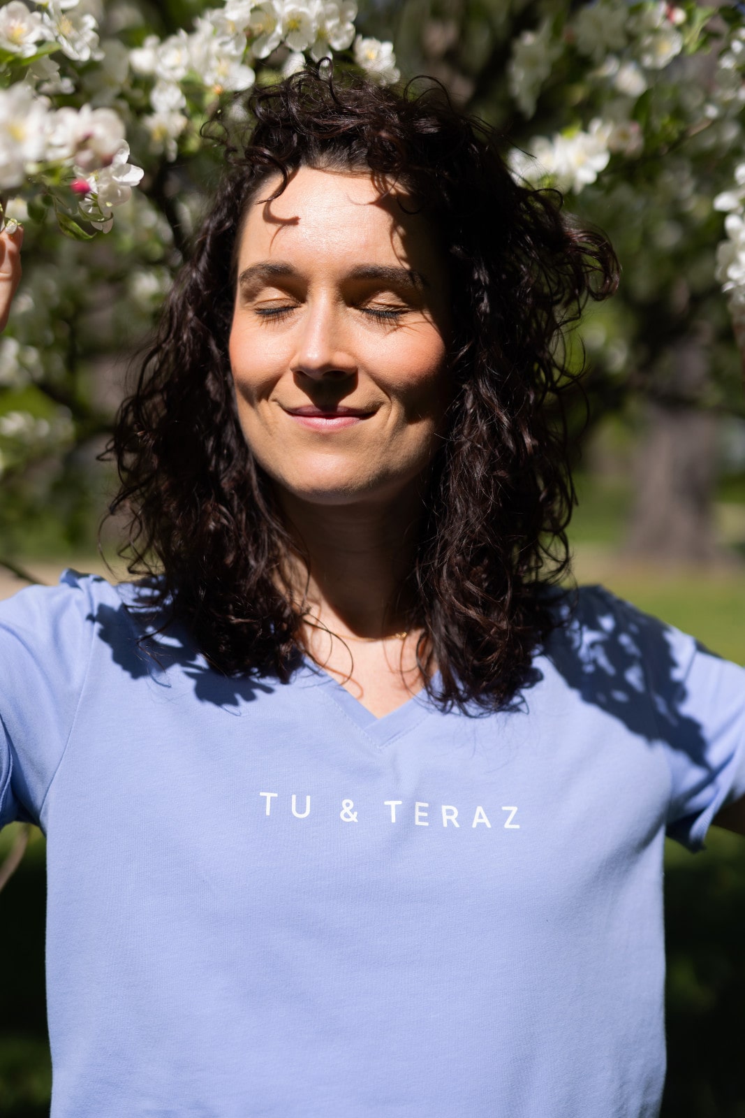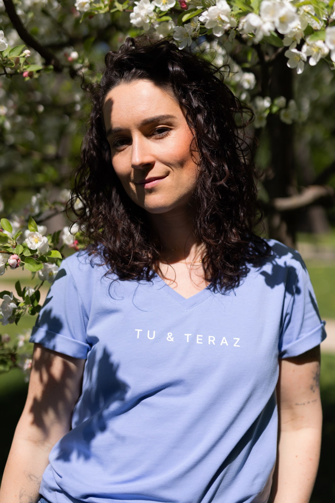 T-shirt oversize błękitny z białym napisem TU&TERAZ