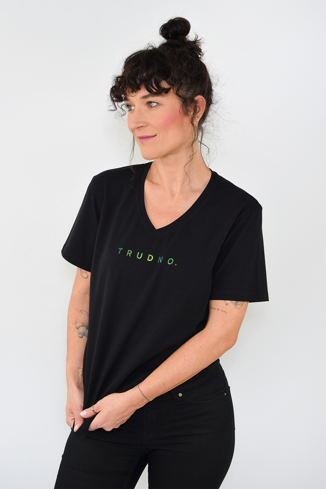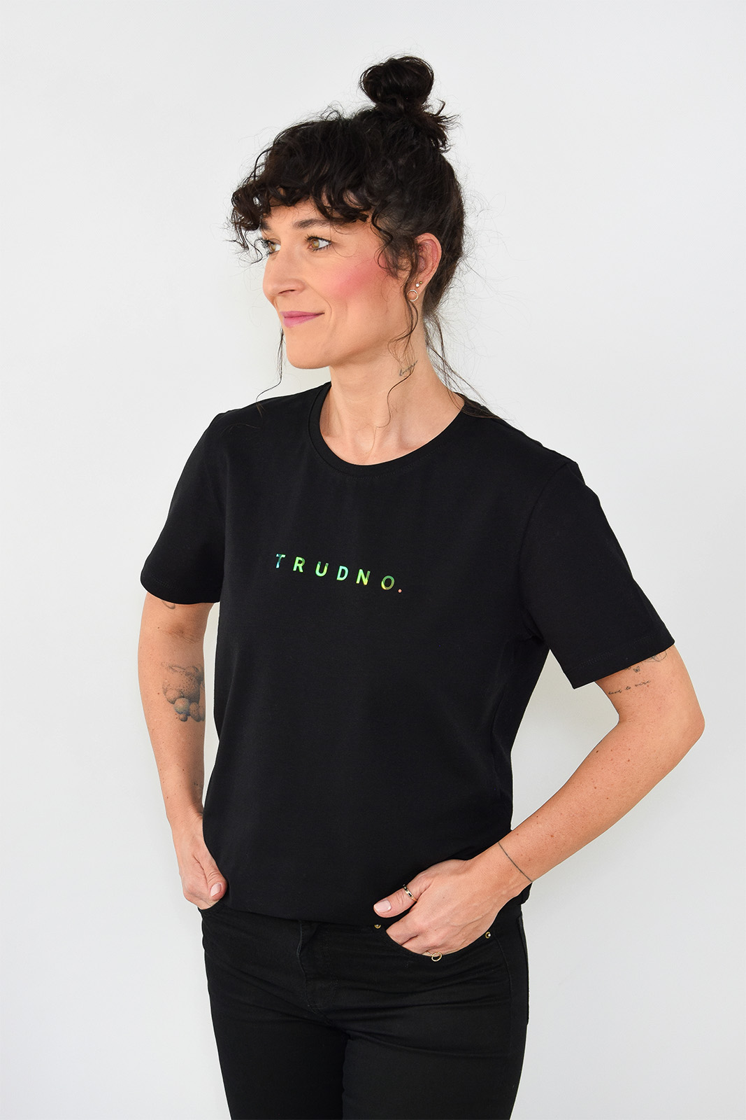 T-shirt oversize czarny z tęczowym napisem TRUDNO.