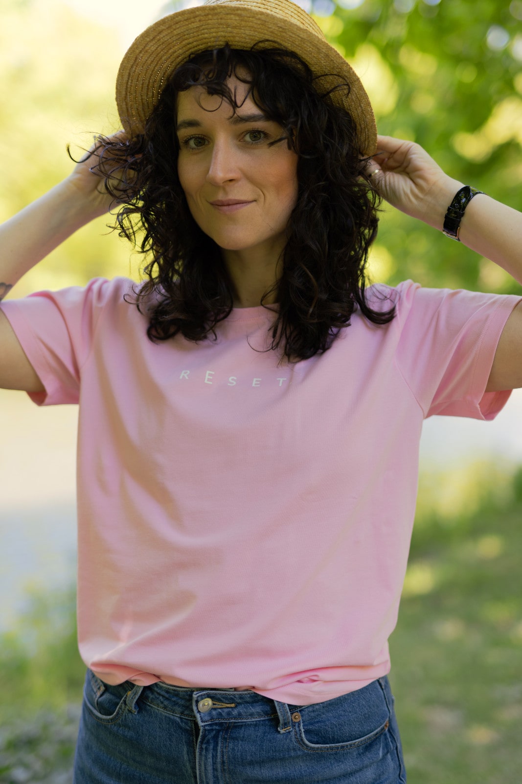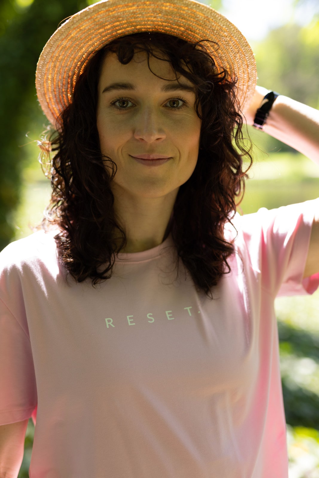 T-shirt oversize jasny różowy z białym napisem RESET.