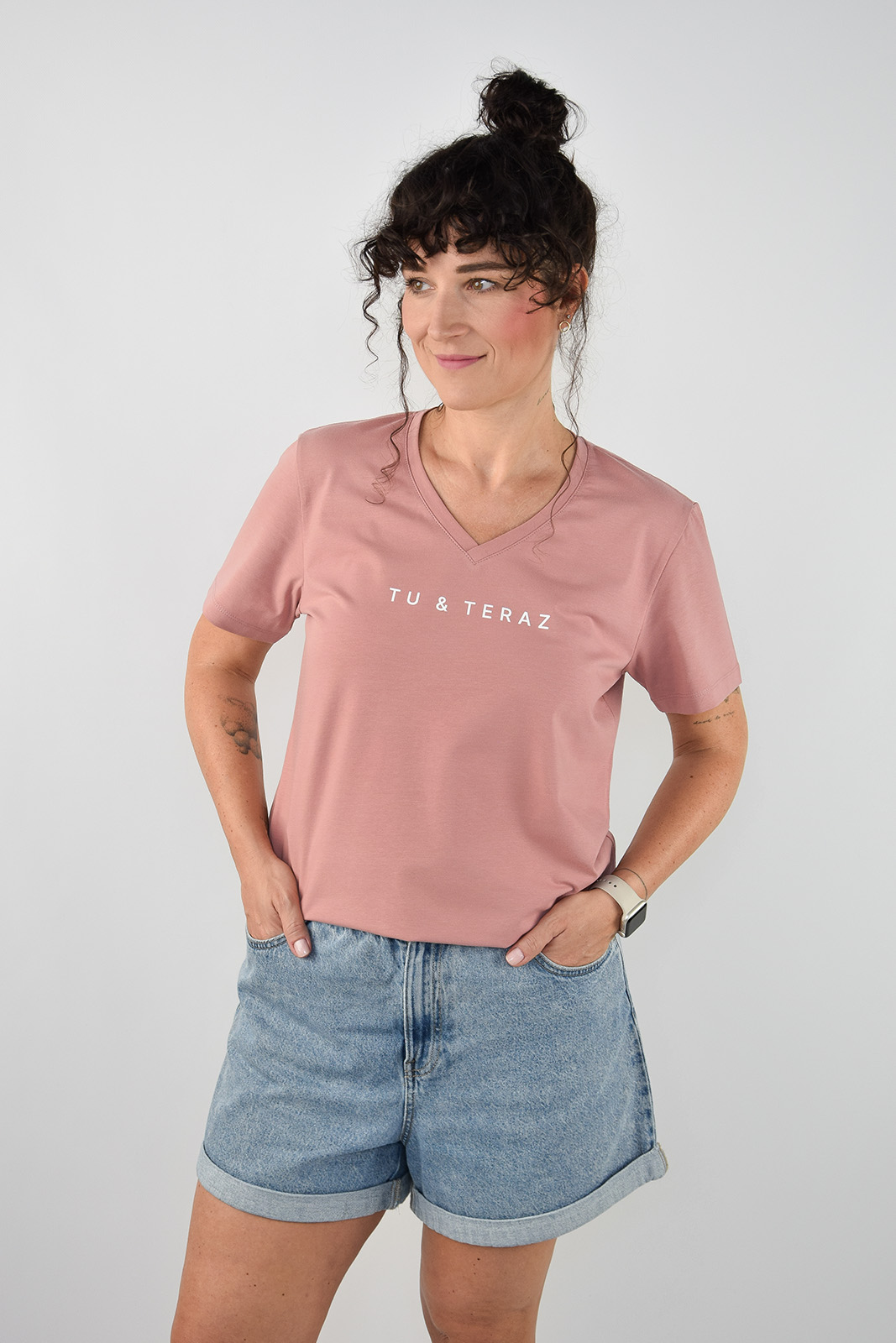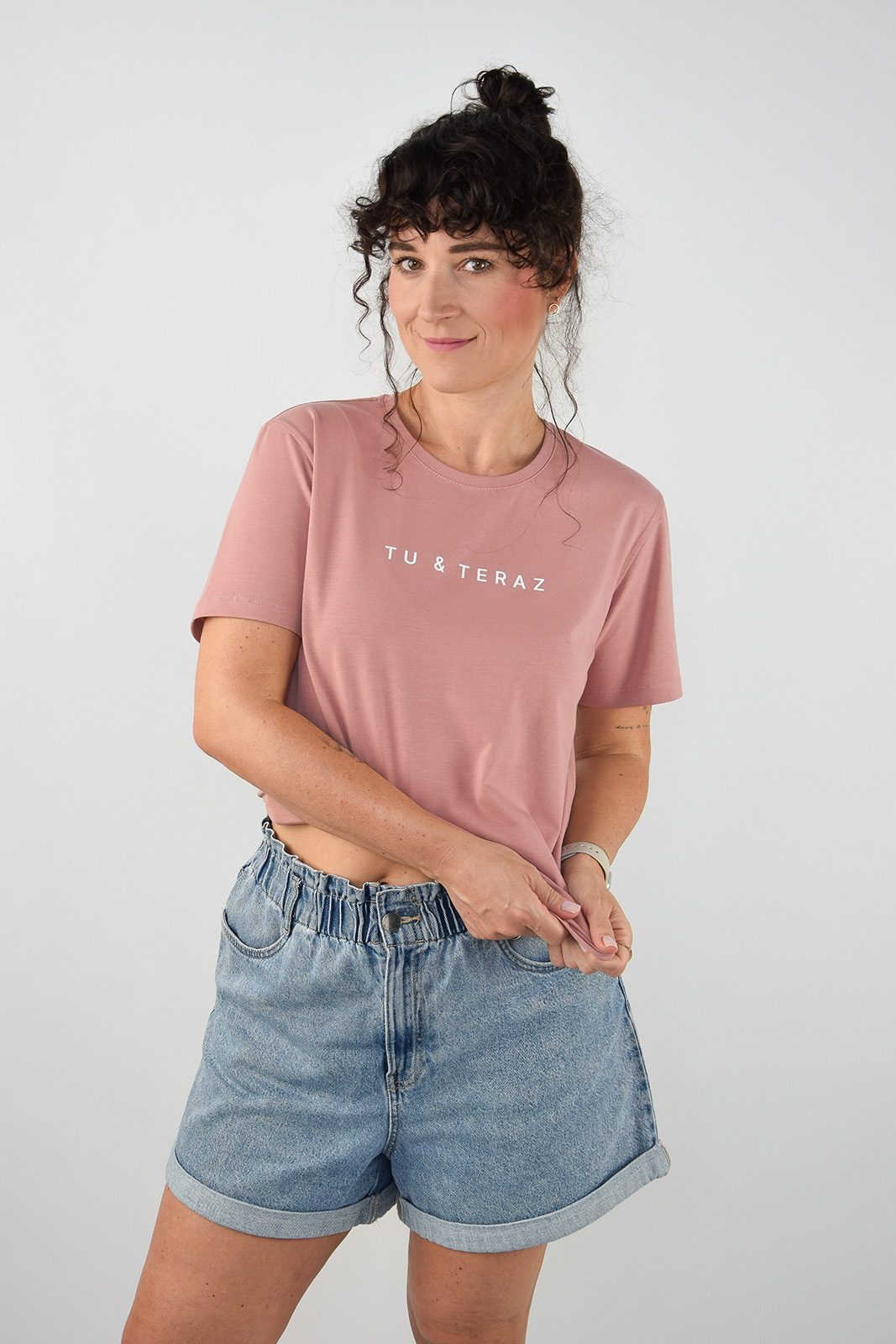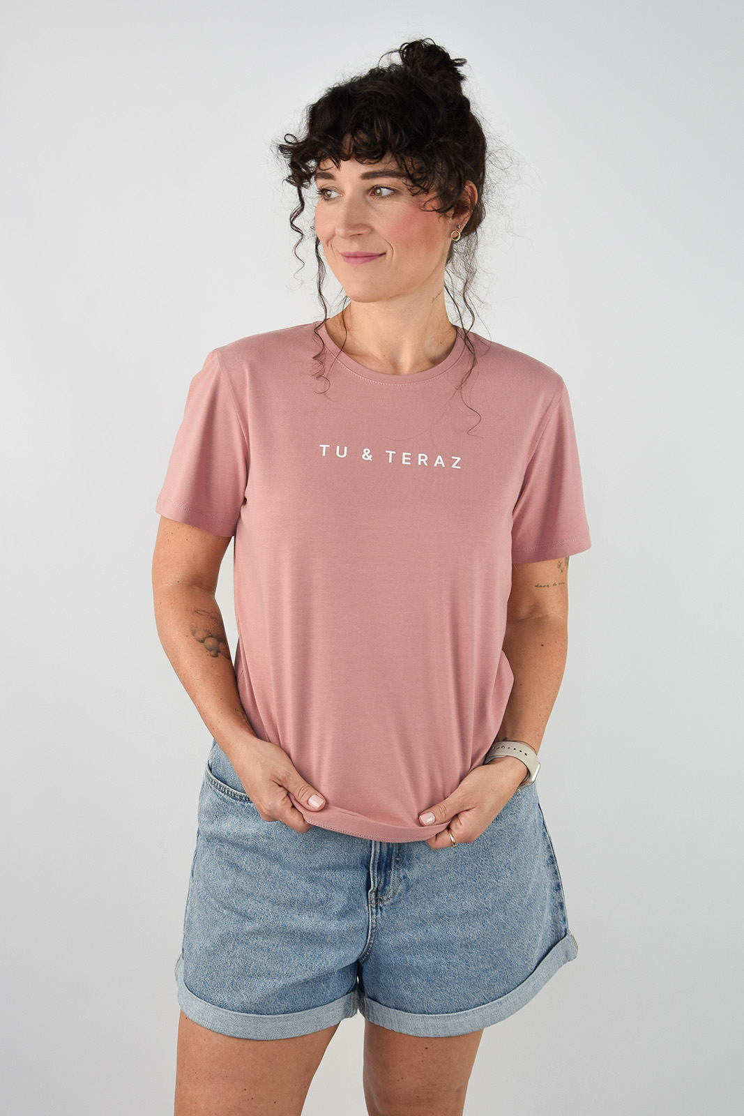 T-shirt oversize różany z białym napisem TU&TERAZ