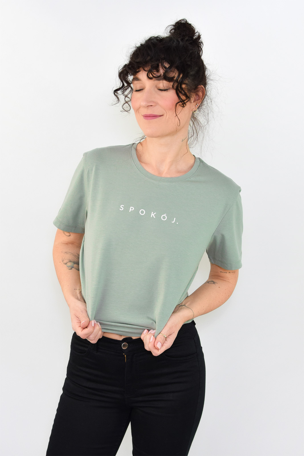 T-shirt oversize zgaszony szałwiowy z białym napisem SPOKÓJ.