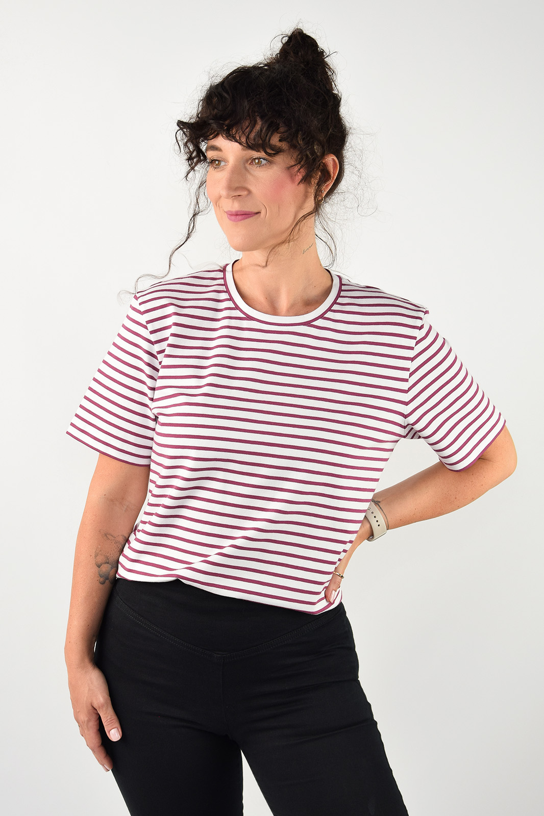 T-shirt oversize w bordowe paski.