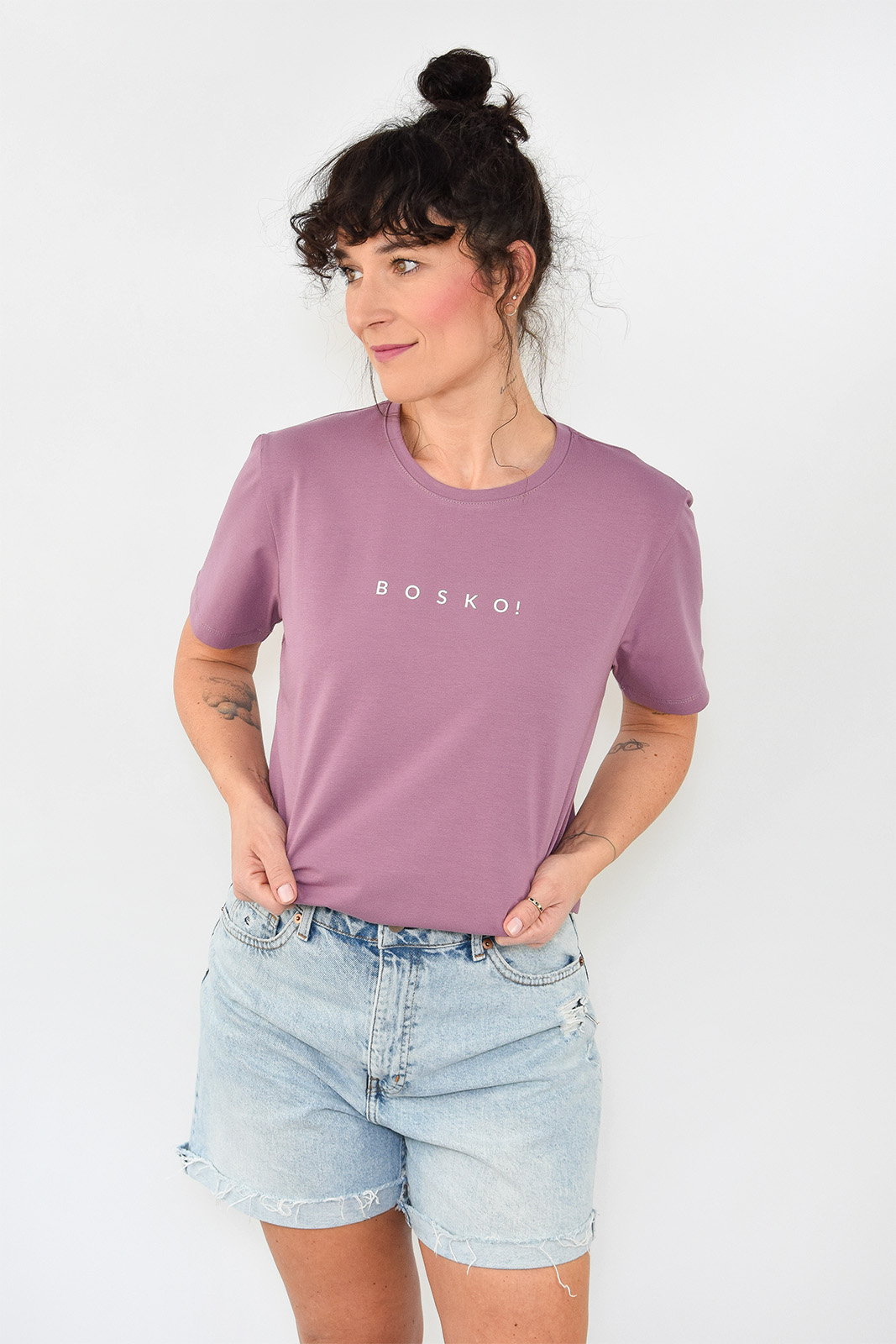 T-shirt oversize zgaszony wrzosowy z białym napisem BOSKO!