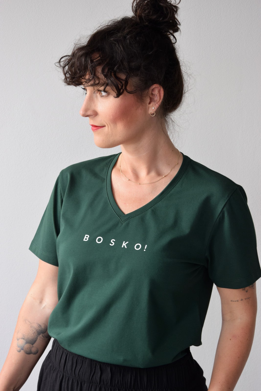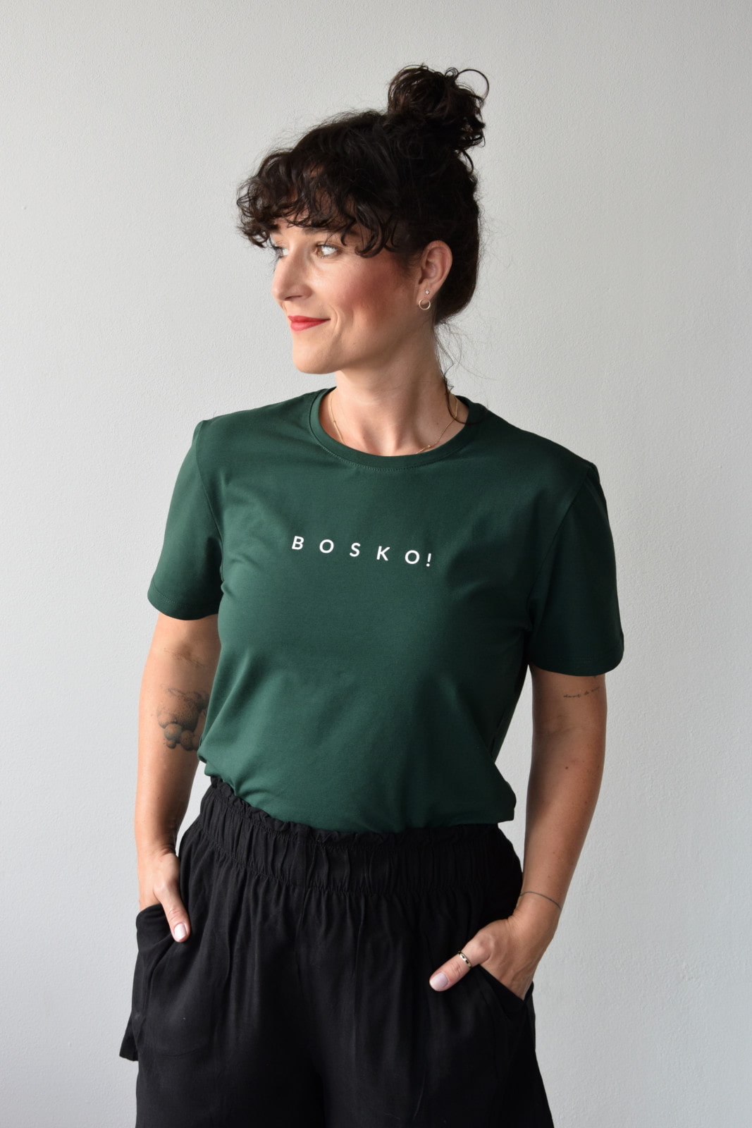 T-shirt oversize zielony butelkowy z białym napisem BOSKO!