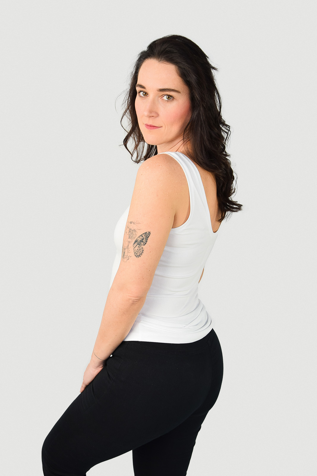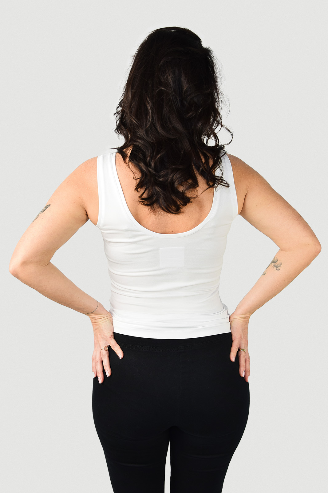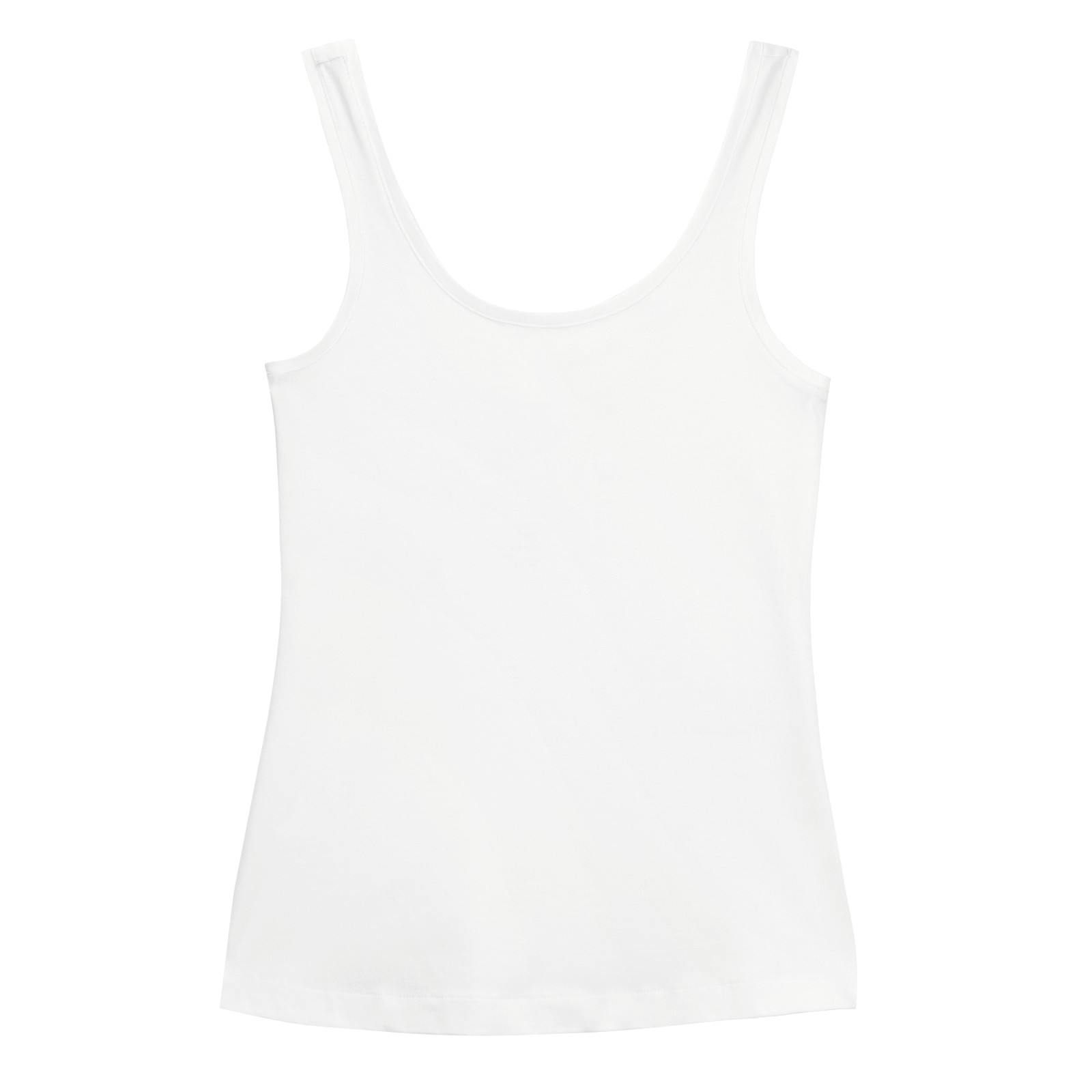 Biały top na grubych ramiączkach, z głębszym dekoltem z tyłu.